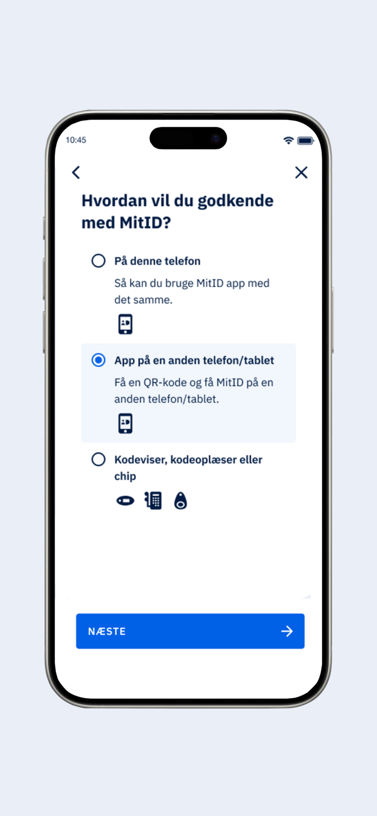 - Select App on another phone/tablet on the screen "How do you want to authenticate with MitID?" Tap Next.